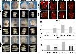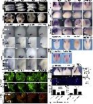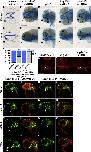 Figure S3. Phenotypic comparison at early stages and TUNEL, PH3 staining, related to Figure 2. (A-L) Frontal views of control and LOF embryos at earlier stages 22, 26 and 30, complement to Fig.2. Scale bar: 200 m. (A’ - L’) Lateral views of control and LOF embryos at earlier stages 22, 26 and 30. Scale bar: 500 m. Whole body phenotypes vary from morphant to morphant. kng morphants displayed a normal head size (B, F, J). Pockets of edema frequently formed in the presumptive heart region starting at stage 26. cpn morphants displayed a larger head relative to the posterior, most obvious at stage 22 (C, G, K). These morphants showed a tendency to disintegrate at high MO levels after stage 30 (hatching), suggesting abnormal epithelial integrity. nNOS morphants showed a diminished overall head size and expanded posterior (D, H, L). All morphants had reduced pigment and diminished movement at low MO levels, and no ability to move at high levels. Cell death was increased in LOF embryos. (M-P) Histological coronal sections showing TUNEL labeling in the presumptive mouth (brackets) at stage 26. Scale bar: 100m. (Q-T) Histological coronal sections with PH3 labeling in the presumptive mouth (brackets) at stage 26. Scale bar: 100m. (U) Graph showing TUNEL data. kng (average n=13.3 positive cells), cpn (average n=23.0 positive cells), and nNOS (average n=17.0 positive cells) morphants have an increase in cell death, respectively, compared with control morphants (average n = 1 positive cell), n = 8 embryos counted per condition, p values < 0.05. (V) Graph showing PH3 positive cells (green) compared to negative cells (red). kng (5% of total cells), cpn (16% of total cells), and nNOS (8% of total cells) morphants have a similar level of cell proliferation, respectively, compared with control morphants (10% of total cells), n = 8 embryos per condition, p values > 0.2. |
