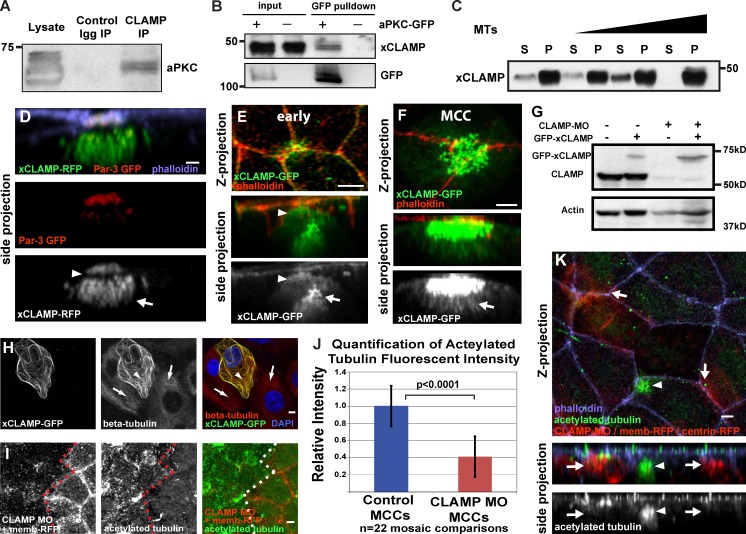 Figure 3. CLAMP interacts with aPKC and stabilizes MTs. (A) Western blot of a coimmunoprecipitation using anti-CLAMP mAb probed with anti-aPKC antibody. (B) Western blot probed with anti-CLAMP mAb of a GFP pull-down using NHS-GFP beads with wild-type lysates (â) or lysates from embryos expressing aPKC-GFP (+). (C) Western blot using anti-CLAMP mAbs of an MT pelleting assay with recombinant GST-tagged CLAMP. S, supernatant fraction; P, pellet. MT concentrations are 0, 0.3, 1.2, and 2.4 µM. (D and E) Localization of CLAMP to the leading edge (arrowheads) colocalized with Par3-GFP (D) and to the centriole cluster (arrows). (F) Image highlighting CLAMP localization to the apical surface and to the associated MTs (arrow). (G) Western blot using anti-CLAMP mAb on lysates from control embryos (lane 1) and embryos injected with GFP CLAMP (lanes 2 and 4) and CLAMP MO (lanes 3 and 4). (H) Staining with antiâβ-tubulin and DAPI of RPE-1 cells expressing xCLAMP-GFP (arrowheads) compared with neighboring non-CLAMP-expressing cells (arrows) after cold-induced MT depolymerization. (I) Acetylated MT staining in mosaic embryos with CLAMP morphant OCs marked with membrane-RFP. (J and K) Quantification (J) and representative image (K) of acetylated MT staining during intercalation in mosaic embryo CLAMP morphant MCCs (arrows), and wild-type MCCs (arrowheads). Membrane-RFP and centrin-RFP were injected to identify CLAMP MOâcontaining MCCs. The distinct staining pattern of acetylated tubulin in MCCs allows for the differentiation control MCCs from other intercalating cell types. Quantification in J is statistically significant (P < 0.0001, t test). Error bars represent standard deviations. See Fig. S2. Bars, 5 µm.