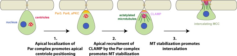 Figure 5. Model for the steps involved in regulating MT stability during radial intercalation. We propose that the Par complex mediates both apical positioning of centrioles (1) and asymmetric accumulation of CLAMP (2). CLAMP asymmetry leads to asymmetric stabilization of MTs (2) along the axis of migration that promotes intercalation (3).