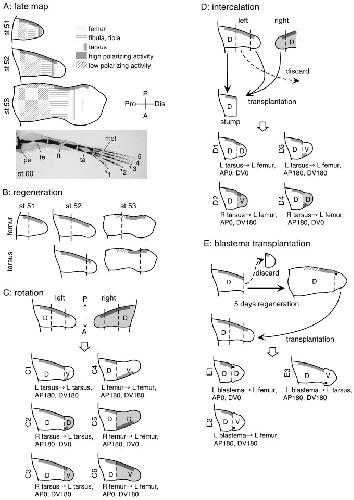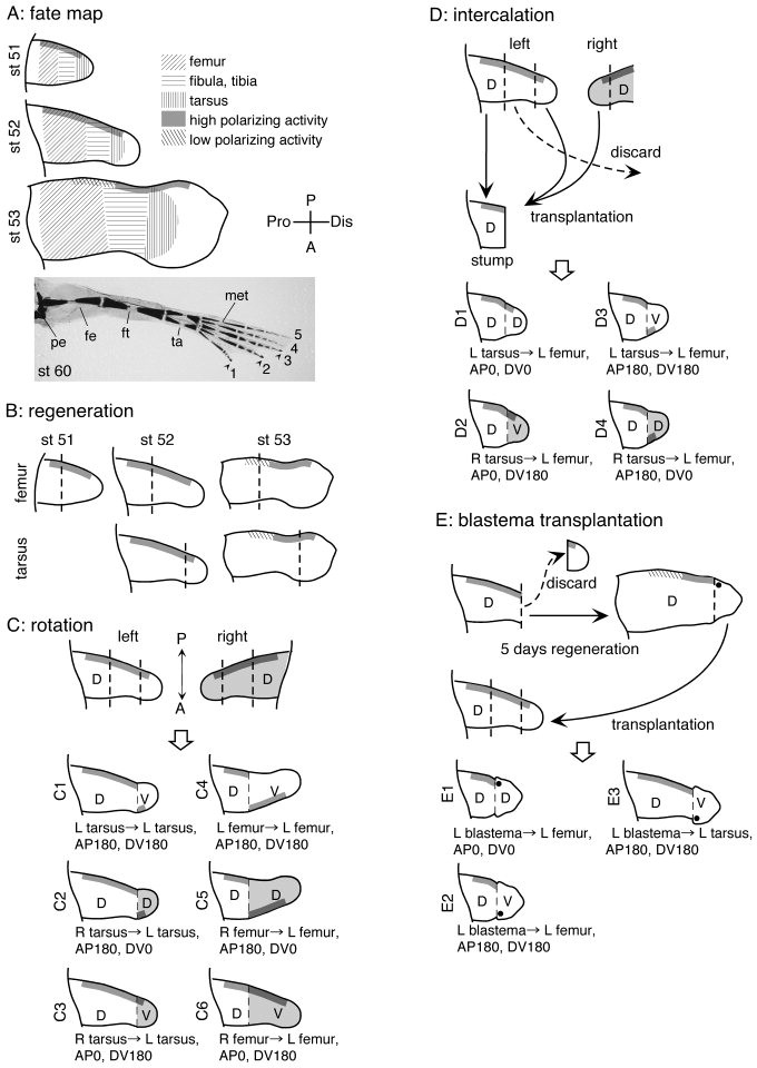 Figure 1. Schematic drawings of the experimental procedures. A: Fate maps adapted from Tschumi (1957). The zone of polarizing activities (Cameron and Fallon, 1977) are combined with the maps. The high and low polarizing activities represent the percentages of digit duplications after a 180-degree rotation (anteroposterior [AP] and dorsoventral [DV] axes were opposed) more than 40% and 20%, respectively. The photograph shows the skeletal preparation of a normal limb at stage 60. The arrowheads indicate anterior digits with a claw. All limbs are left hindlimbs and dorsal view. pe, pelvis; fe, femur; ft, fibula and tibia; ta, tarsus; met, metatarsus; â12345,â digits; A, anterior; P, posterior; Pro, proximal; Dis, distal; st, stage. B: Amputation levels for normal regeneration. The limb buds were amputated at the distal fourth of the presumptive femur level (st 51â54) or the middle of the presumptive tarsus level (stage 52â54). The amputation levels of stage 54 were not presented in this figure. C: Rotation of limb buds. The limb buds were amputated at the presumptive femur or tarsus level and grafted to the stumps. The left (L) and right (R) limbs are represented by white and gray, respectively. Stage 52 limb buds are shown in this figure. D, dorsal; V, ventral. D: Induction of intercalary limb regeneration. The limb bud tips were prepared by the amputation of limb buds at the presumptive tarsus level and transplanted to the stumps that were amputated at the presumptive femur level. The presumptive zeugopodium (fibula and tibia) were discarded. Stage 52 limb buds are shown in this figure. E: Transplantation of blastemas. Formation of blastemas was induced by the amputation of the stage 52 limb bud at the presumptive tarsus level. Five days after amputation (the tadpole developed to stage 53), the blastema was transplanted to the stage 52 stump, which was amputated at the presumptive femur or tarsus level. The dot indicates the posterior side of blastema. |