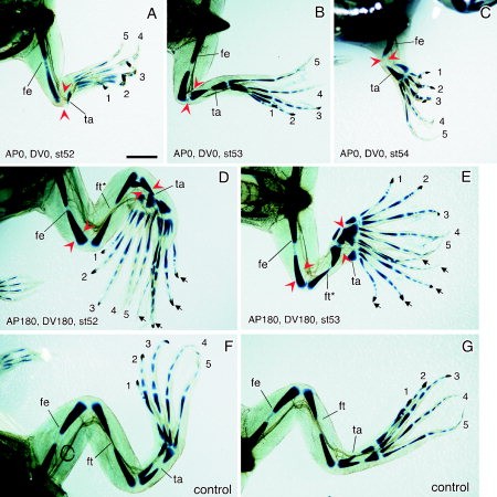 Figure 4. Intercalary regeneration. The limb bud tip (amputated at the presumptive tarsus level) was transplanted to the stump (amputated at the presumptive femur level). The presumptive zeugopodium (fibula and tibia) were discarded. Stage (st) 52 (A,D,F), stage 53 (B,E,G), and stage 54 (C) tadpoles were used for this experiment. The transplantation procedure is shown in Figure 1D. AâC and D,E correspond to D1 and D3 in Fig. 1D, respectively. The control right limbs (F,G) and operated left limbs (D,E) are the same animals, respectively. The red arrowheads indicate the amputation plane. The black arrows represent supernumerary digits. Asterisks indicate the regenerated fibula and tibia. fe, femur; ft, fibula and tibia; ta, tarsus; â12345,â digits; AP, anteroposterior; DV, dorsoventral. Scale bar = 2 mm in A (applies to AâG). |
