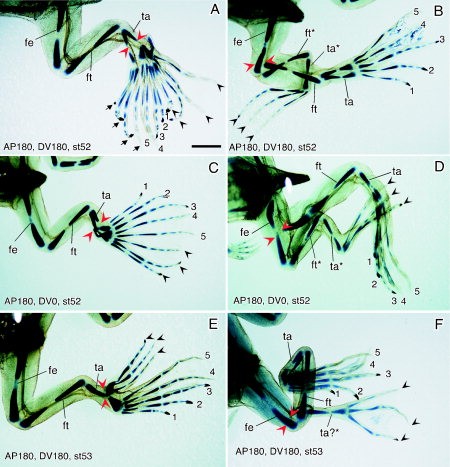 Figure 3. Supernumerary regeneration induced by the rotation of the limb bud tip. The limb bud was amputated and rotated at stage (st) 52 (AâD) or stage 53 (E,F). The transplantation procedure is shown in Figure 1C. A and E, B and F, C, and D correspond to C1, C4, C2, and C5 in Fig. 1C, respectively. âDouble supernumerary limbsâ indicates the limb with two sets of supernumerary digits generated at both the anterior and posterior sides, as seen in A. âSingle supernumerary limbâ indicates the limb with a single set of supernumerary digits generated at either the anterior or posterior, as seen in BâF. The red arrowheads indicate the amputation plane. The black arrowheads and arrows represent each set of supernumerary digits. Asterisks indicate supernumeraries. fe, femur; ft, fibula and tibia; ta, tarsus; â12345,â digits; AP, anteroposterior; DV, dorsoventral. Scale bar = 2 mm in A (applies to AâF). |
