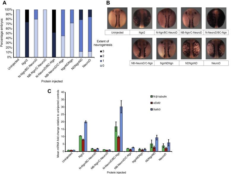 Fig. 4. In vivo proneural activity assayed in developing Xenopus embryos. X. laevis embryos were injected at one cell stage with 50 pg of mRNA encoding chimeric constructs as indicated. Embryos were fixed at Stage 19 for ISH analysis of neural β-tubulin expression and scored for the extent of neurogenesis relative to uninjected controls. (A) Semi-quantitative ISH scoring data [n = 22â36], 0â3 where 0 indicates no increase in neurogenesis to 3, highly extensive neurogenesis throughout the epidermis. (B) Representative images of embryos injected with each construct. (C) X. laevis embryos were injected at one cell stage with 100 pg domain-swap mRNA and analysed by qPCR at stage 19 for neural β-tubulin, xEbf2 or Xath3 expression, relative to uninjected embryos. n = 2. Errors are Standard Error of the Mean (SEM).