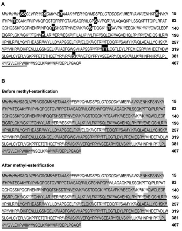 Mass spectrometric analysis of proteolytically derived phosphopeptides has developed into a widespread technique for the identification of phosphorylated amino acids. Using liquid chromatography-electrospray ionization tandem mass spectrometry, 14 phosphorylation sites were identified on Xenopus laevis His6-Aurora A, a highly conserved regulator of centrosome maturation and cell division. These included seven novel phosphorylation sites, Ser-12, Thr-21, Thr-103, Ser-116, Thr-122, Tyr-155, and Thr-294, as well as the previously identified regulatory sites, Ser-53, Thr-295, and Ser-349. The identification of these novel phosphorylation sites will be important for future studies aimed at elucidating the mechanisms of Aurora A regulation by phosphorylation. Furthermore, we demonstrate that a "kinase-inactive" mutant of Aurora A, K169R, still retains 10% of activity of the wild-type enzyme in vitro along with occupancy of Thr-295 and Ser-12. However, mutation of Asp-281 to Ala completely abolishes activity of the enzyme and should therefore be used preferentially as a genuine kinase-dead construct. Because of the abundance of phosphorylated residues on His6-Aurora A, we found this protein to be an ideal tool for the characterization of immobilized metal-affinity chromatography (IMAC) as a method for phosphopeptide enrichment from complex mixtures. We present a detailed analysis of the binding and elution properties of both the phosphopeptides and unphosphorylated peptides of His6-Aurora A to Fe3+-IMAC before and after methyl esterification. Moreover, we demonstrate a significant difference in enrichment of phosphopeptides when different resins are used for Fe3+-IMAC and characterize the strengths and limitations of this methodology for the study of phosphoproteomics.