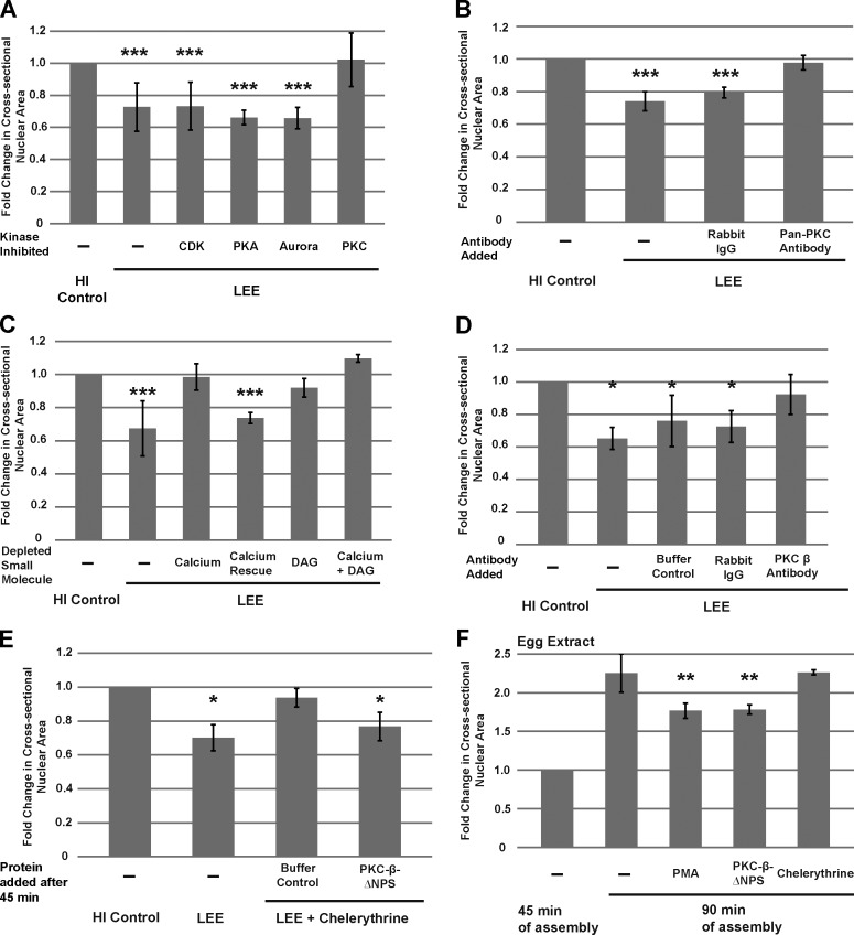 Dramatic changes in cell and nuclear size occur during development and differentiation, and aberrant nuclear size is associated with many disease states. However, the mechanisms that regulate nuclear size are largely unknown. A robust system for investigating nuclear size is early Xenopus laevis development, during which reductions in nuclear size occur without changes in DNA content. To identify cellular factors that regulate nuclear size during development, we developed a novel nuclear resizing assay wherein nuclei assembled in Xenopus egg extract become smaller in the presence of cytoplasmic interphase extract isolated from post-gastrula Xenopus embryos. We show that nuclear shrinkage depends on conventional protein kinase C (cPKC). Increased nuclear cPKC localization and activity and decreased nuclear association of lamins mediate nuclear size reductions during development, and manipulating cPKC activity in vivo during interphase alters nuclear size in the embryo. We propose a model of steady-state nuclear size regulation whereby nuclear expansion is balanced by an active cPKC-dependent mechanism that reduces nuclear size.