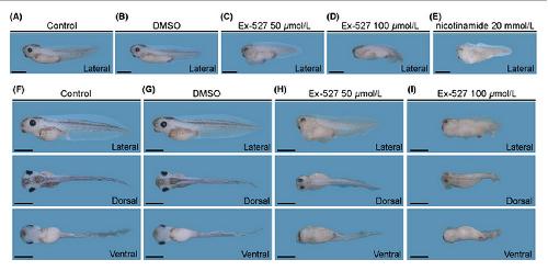 Figure 3. Ex-527 treatment induced edematous swelling, short body axis, and small head. (A,F) Control embryos at stage 38 and 41. (B,G) Dimethylsulfoxide (DMSO)-treated embryos. (C,H) Embryos treated with 50 μmol/L of Ex-527. Ventral edema formations (11/15) and eye malformations (12/15) were detected at stage 38 and 41. (D,I) Embryos treated with 100 μmol/L of Ex-527. Ventral edema formations (12/12) and eye malformations (12/12) were detected at stage 38 and 41. (E) Embryos treated with 20 mmol/L of nicotinamide. Ventral edema formations (16/18) and eye malformations (18/18) were detected at stage 38. Average lengths of embryos were decreased in dose-dependent manner. Scale bars of A to E represent 1 mm.