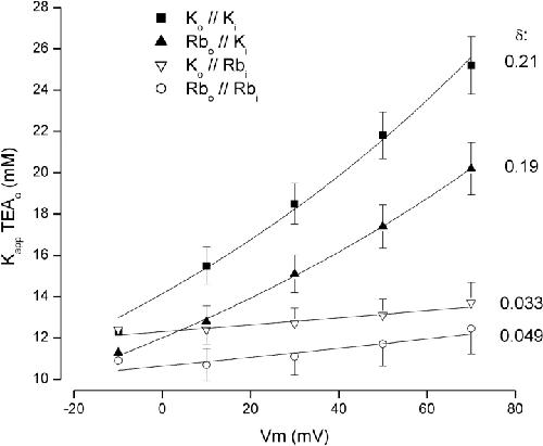 Figure 2. . Voltage dependence of TEA block in K+ and Rb+ solutions. The apparent Kd for external TEA block, Kapp, is shown as a function of membrane potential for solutions containing K+ on both sides of the channel (▪), solutions with external and internal Rb+ (○), external Rb+ and internal K+ (▴), and external K+ with internal Rb+ (▿). Lines are fits of Eq. 2 to the data with the indicated value of δ.