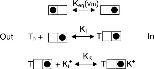 Figure 4. . Voltage dependence of the selectivity filter effective K+ equilibrium, Keq, and the inner vestibule K+ site affinity, KK. The Keq (▪) and KK (○) data were obtained as described in text. The lines are fits of Eq. 2 to the data. The electrical distance parameter, δ, for the selectivity filter equilibrium is 0.37, measured from the external side. The electrical distance for the vestibule site is 0.13 into the membrane electric field from the inner side, indicated by the minus sign. Other parameters from the fit are described in the text.