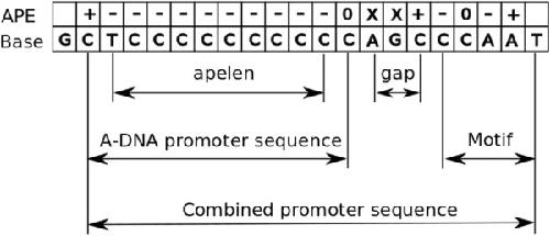 A combined promoter sequence consists of an A-form promoter element followed by a direct read-out promoter motif. The APE row indicates the signs of the APE values for the sequence in the Base row; with X denoting undetermined APE values [11]. The main parameters are the number of negative APE values in the APS (apelen), and the gap between the APS and the motif.