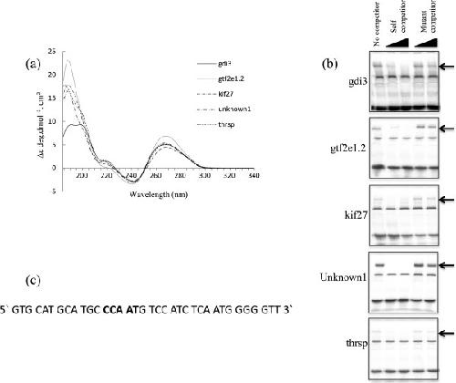 The five selected sequences and their predicted binding proteins. Each of the putative promoter elements (ppe) sequences are within 500 bp 5′ of the transcription start site of the genes-gdi3, gtf2, kif27, thrsp and unknown1, The key elements with potential gene regulatory function are underlined with grey arrows. The black arrow above each oligonucleotide indicates a putative transcription factor binding site and its direction of binding. The putative transcription factor binding sites were predicted using the EMBOSS database run through Geneious R7 7.1.4.
