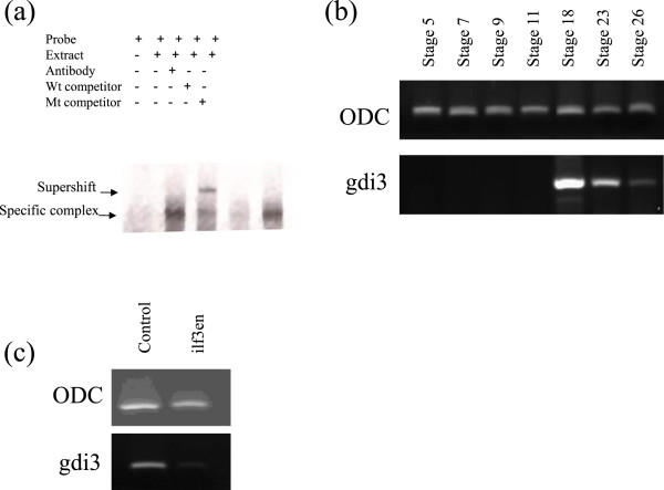 mRNA is maximal at neurula stage and can be modulated by ilf3. (a) The complex gdi3 specific complex can be supershifted by addition of anti-ilf3 antibody. (b) The gdi3 gene expression is zygotic and peaks at neurula stage 18 when ilf3 is known to be nuclear and active. (c) Expression of gdi3 is ablated relative to an internal control, ODC, by exogenous expression a dominant-negative form of ilf3 (ilf3en) which acts at the transcriptional level.