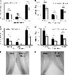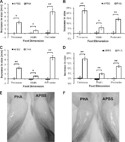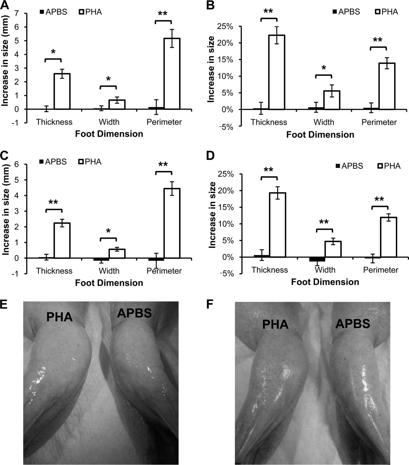 FIG 2 Intramuscular injection of phytohemagglutinin (PHA) into the foot of X. laevis induces inflammatory swelling after 24 h (A, B, and E) and 48 h (C, D, and F). PHA injections induced significantly greater swelling than buffer (APBS) controls (*, P < 0.01; **, P < 0.001 [paired Student's t test; alpha set to 0.017 for multiple tests]). The data show the mean (± the SEM) increase in actual size (A and C) or percent increase (B and D) in foot size compared to each foot's measurement before injection from both feet of six frogs. Representative photographs of individuals at 24 h (E) or 48 h (F) after injection of APBS in the leftfoot and PHA into the rightfoot (pictures show ventral side of frogs).