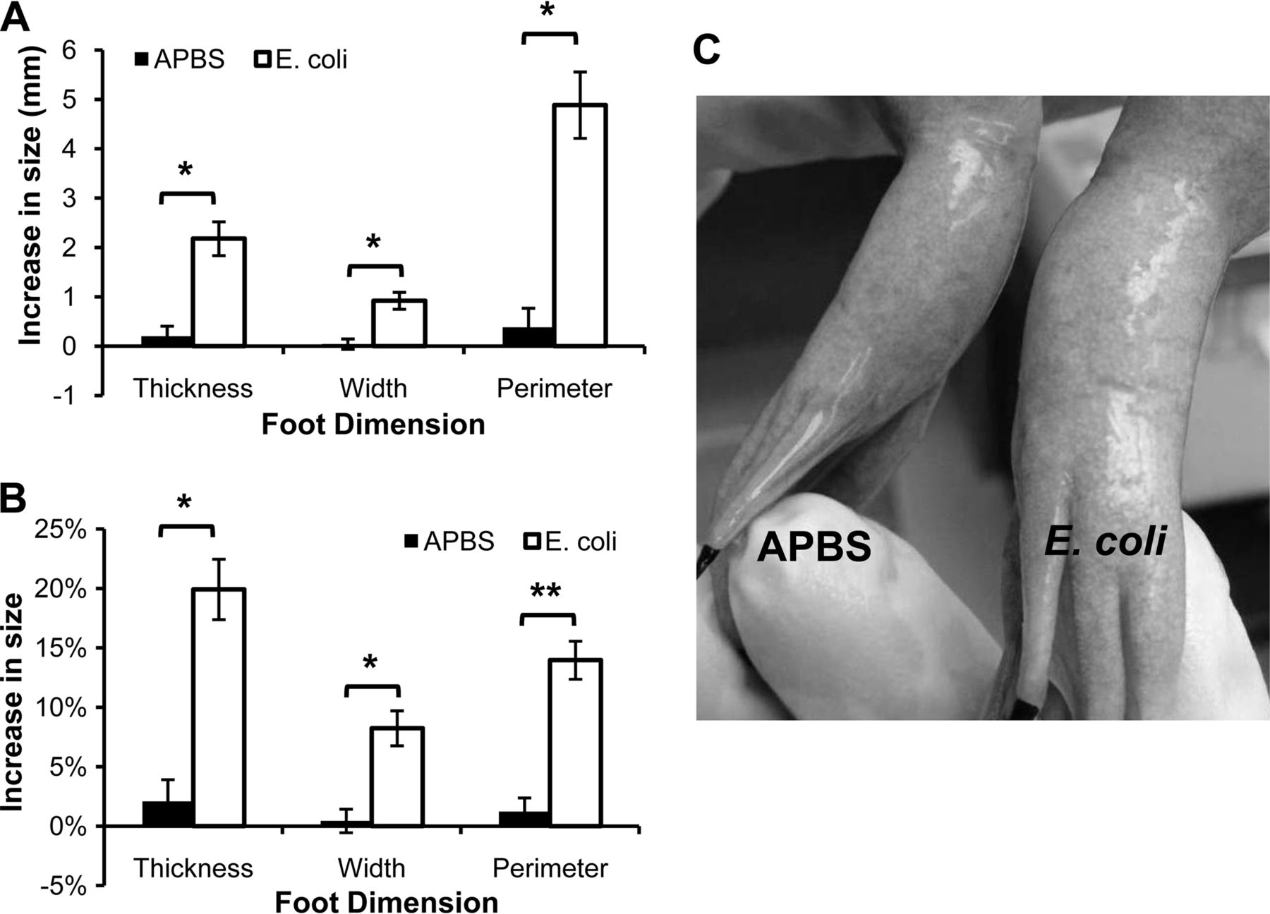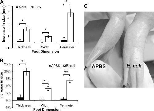 FIG 3 Intramuscular injection of killed E. coli into the foot of X. laevis induces inflammatory swelling after 24 h. E. coli injections induced significantly greater swelling than buffer (APBS) controls (*, P < 0.01; **, P < 0.001 [paired Student's t test; alpha set to 0.017 for multiple tests]). The data show the mean (± the SEM) increase in actual size (A) or percent increase (B) in foot size compared to each foot's measurement before injection from both feet of six frogs. (C) Representative photograph of an individual 24 h after injection of APBS in the rightfoot and of killed E. coli into the leftfoot (the picture shows the ventral side of the frog).