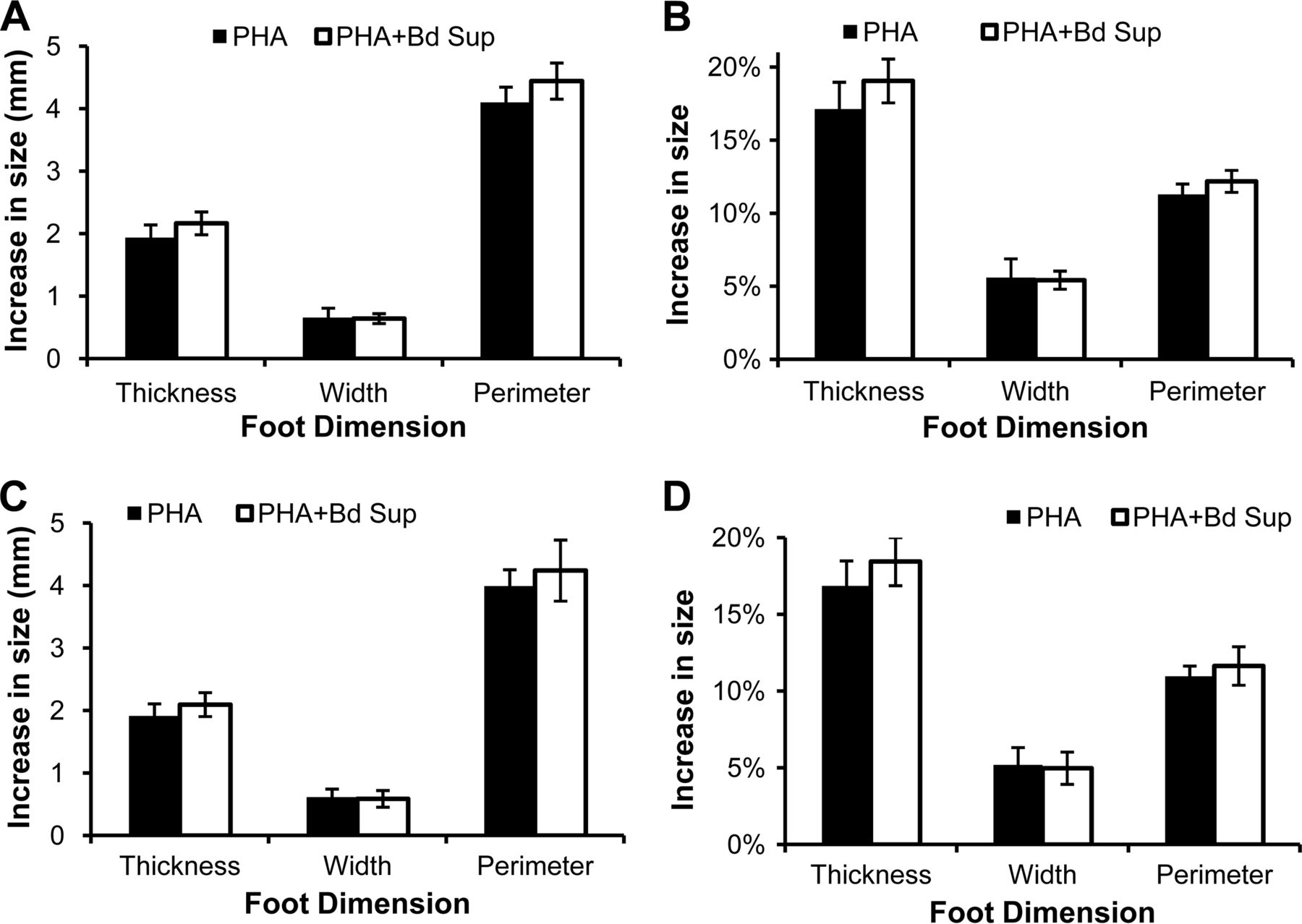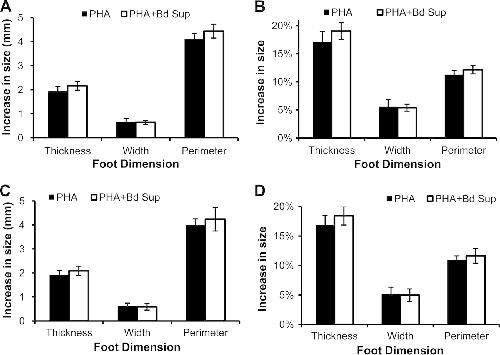 FIG 5 B. dendrobatidis supernatant (Bd Sup) does not impair inflammatory swelling induced by a single PHA injection (frogs were not primed with PHA). X. laevis feet were injected with PHA alone or with PHA and Bd Sup. Feet were measured before injection and at 24 h (A and B) and 48 h (C and D) after injection. The data show the mean (± the SEM) increase in actual size (A, C) or percent increase (B, D) in foot size compared to each foot's measurement before injection from both feet of six frogs. Swelling was not significantly different between treatments (paired Student's t test).