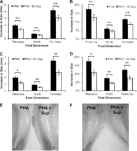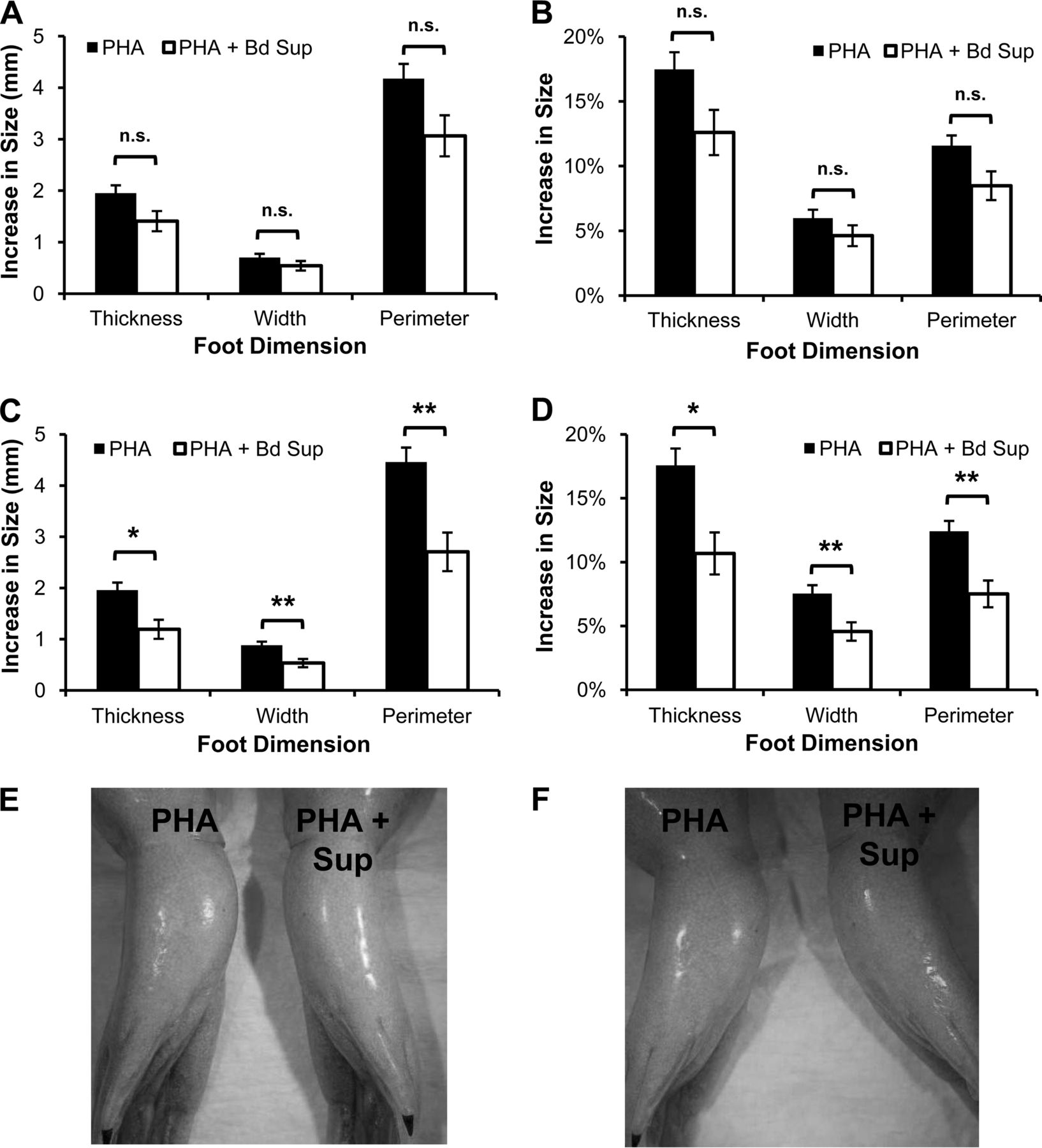FIG 6 B. dendrobatidis supernatant (Bd Sup) reduces inflammatory swelling induced by a second PHA injection. X. laevis feet were injected with PHA alone or with PHA and Bd Sup 7 days after priming with intraperitoneal injection of PHA. Feet were measured before injection and at 24 h (A, B, and E) and 48 h (C, D, and F) after injection. The data show the mean (± the SEM) increase in actual size (A and C) or percent increase (B and D) in foot size compared to each foot's measurement before injection from both feet of 12 frogs. Swelling was only significantly different between treatments in feet 48 h after injection. n.s., P > 0.017; *, P < 0.01; **, P < 0.001 (paired Student's t test; alpha set to 0.017 for multiple tests). Representative photographs of an individual at 24 h (E) and 48 h (F) after the injection of PHA and Bd Sup in the leftfoot and PHA alone into the rightfoot (the pictures show the ventral side of the frog).