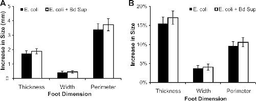 FIG 7 B. dendrobatidis supernatant (Bd Sup) does not impair inflammatory swelling induced by killed E. coli. X. laevis feet were injected with either killed E. coli alone or E. coli with Bd Sup. Feet were measured before injection and 24 h after injection. The data show the mean (± the SEM) increase in actual size (A) or percent increase (B) in foot size compared to each foot's measurement before injection from both feet of 12 frogs. Swelling was not significantly different between treatments (paired Student's t test).