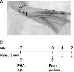 FIG 1 Experimental design for injection of feet with inducers of inflammatory swelling. (A) X. laevis feet were injected intramuscularly in the middle of the foot on the plantar side (arrow). Measurements of the foot thickness (bracket) and width (perpendicular to the thickness) were recorded with a caliper. (B) Schematic of foot injections. Foot injections occurred on day 0 with either APBS, PHA alone, killed E. coli alone, PHA and B. dendrobatidis supernatant (Bd Sup), or killed E. coli and B. dendrobatidis supernatant. Intraperitoneal (i.p.) injection with PHA only occurred for defined experiments in which frogs were primed with PHA. The time points at which feet were measured are indicated (+).