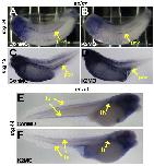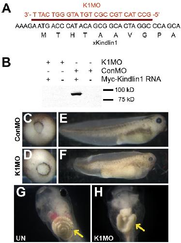 Fig. 1 â Developmental delays and aberrant gut morphology caused by loss of xkindlin1. (A) Sequence of K1MO used to target one alloallele of xkindlin1. (B) K1MO blocks translation of exogenously expressed Myc-tagged xkindlin1 RNA revealed by western blot with anti-Myc antibody. (CâD) ConMO (C) or K1MO (D) injected embryos at gastrula stage, appearance of blastopore indicates normal timing and morphology. (EâF) ConMO injected normal tadpole stage embryo (E); K1MO embryo is delayed with general ââsicklyââ appearance (F). (GâH) Gut morphology (yellow arrows) in late tadpole embryos reveals normal gut coils in uninjected (UN) tadpoles (G); K1MO injected tadpoles exhibited deformed guts with significantly reduced coiling (H). |
