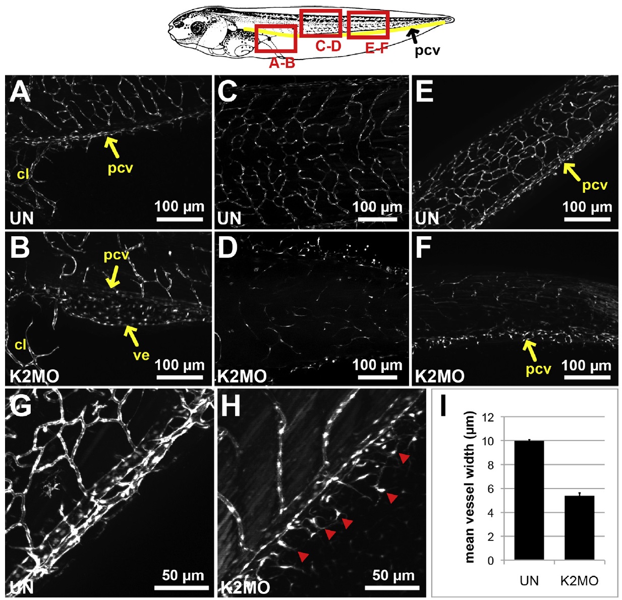 Fig. 5 â Angiogenesis and vascular maintenance was compromised in K2MO injected kdr:GFP transgenic tadpoles. Cartoon of stage 46 embryo (Nieuwkoop and Faber, 1967) with approximate locations of image fields depicted in labeled panels (red boxes). (AâH) Extended focus grid confocal micrographs of transgenic tadpoles imaged live. Panels are arranged so that dorsal is up and anterior is left. (A) Uninjected (UN) tadpoles had normal posterior cardinal veins (pcv) and an elaborate branched network of blood vessels throughout the trunk of the embryo including around the cloaca (cl). (B) K2MO morphants formed aberrant ventral edemas (ve) and swelling of the pcv. (CâF) Angiogenic sprouting of blood vessels was severely reduced in K2MO morphants compared to controls and the epithelial morphology of major blood vessels including the pcv was disrupted in K2MO morphants. (GâH) A magnified view of paired pcvs showing that in K2MO morphants, endothelial cells around the pcv appeared mesenchymal with multiple long protrusions (examples highlighted with red arrowheads), in stark contrast to the normal epithelial nature of endothelial cells at this region. (I) Quantification of the mean blood vessel width in uninjected compared to K2MO injected embryos; blood vessels widths observed in K2MO morphants were narrower than controls. For measurements, vessels were defined as a tubular stretch of endothelial cells between two branch points within the trunk of the embryo. Three width measurements were taken across the length of each vessel and averaged (UN: N = 8 tadpoles, n = 393 blood vessels; K2MO: N = 9 tadpoles, n = 80 blood vessels; error bars = SEM; p < 0.0001). |