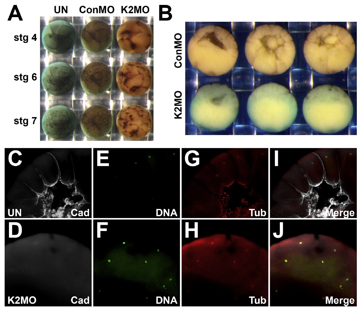 Fig. 7 â Loss of maternal xkindlin2 resulted in cytokinesis failure. (A) Cleavage stage embryos derived from MO-injected oocytes that were cultured for 2 days and then passaged through a host mother and fertilized in vitro. Uninjected (UN) and ConMO injected embryos progressed through multiple cleavages and developed into normal tadpoles. However, K2MO morphants failed to exhibit distinct cleavage planes. Pigmented indentations formed on the surface of the embryo but normal cleavage planes did not form. (B) Bisected blastulae from oocytes injected with either ConMO or K2MO. Small animal and large ventral blastomeres arranged around a blastocoel cavity are evident in ConMO morphants; K2MO morphants appeared as a solid mass lacking cell borders. (CâJ) Extended focus confocal micrographs of immunostained bisected embryos. Lack of membrane-associated C-cadherin (Cad) confirmed that K2MO morphants failed to form cell boundaries. Sytox-green (DNA, green) and a-tubulin staining (red) demonstrated presence of multiple nuclei in K2MO morphants even in the absence of cytokinesis. |