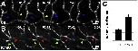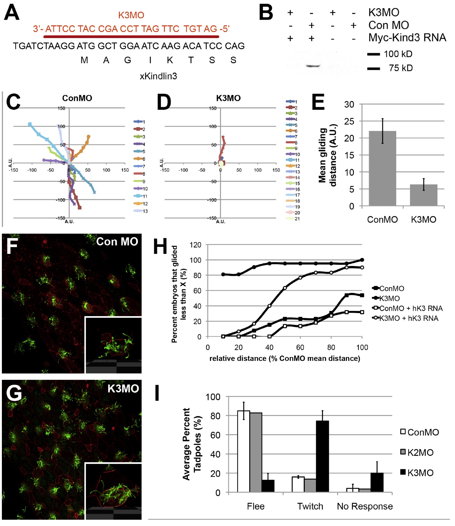 Fig. 8 â Defects in ciliary beating and partial paralysis in xkindlin3 morphants. (A) Sequence of K3MO used to target xkindlin3. (B) K3MO knocked down expression of exogenously expressed Myc-tagged xkindlin3 RNA revealed by western blot with anti- Myc antibody. (CâD) Spider diagrams of individual tailbud embryos that glided across the surface of a petri dish over 30 s. (E) Quantification of mean gliding distance for ConMO and K3MO injected embryos (N = 6, n = 121 and 172 respectively). (FâG) Extended focus confocal micrographs from whole-mount tailbud stage embryos immunostained for a-tubulin (green) and phalloidin (red) to visualize the ciliated epidermis of ConMO and K3MO morphants. Insets are 3-D projections of a single multi-ciliated cell. (H) Quantification of the phenotypic rescue of the gliding defect in embryos injected with both K3MO and a non-targetable human kindlin3 transcript (hK3 RNA). Gliding speeds varied widely in rescued embryos likely due to nonuniform expression of the rescue protein in individual embryos. 10 bins were created representing the percent of the mean distance traversed by ConMO embryos in 10% increments plotted along the x-axis represented as relative distance. At each point, the percent of embryos that traversed a distance equal to or below it was plotted along the y-axis for each group. A majority of K3MO morphants were more static relative to ConMO morphants. Over-expression of hK3 RNA decreased the percentage of K3MO morphants able to traverse short distances compared to ConMO. Movie S7 demonstrates this partial rescue from one representative experiment. (I) Quantification of MO-injected embryo responses to touch with a hairloop. Tadpoles that swam to the edge of the dish were scored as ââflee,ââ tadpoles that twitched in response but could not swim away were scored as ââtwitchââ and tadpoles that failed to respond after at least 20 touches were scored as ââno responseââ. Only K3MO morphants were impaired in their ability to flee from a tactile insult (ConMO: N = 3, n = 57; K2MO: N = 1, n = 29; K3MO: N = 3, n = 53; error: SD). |