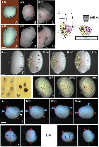 min after excision. (H) Time-lapse film of Xbra domain, same view as in E, random cell movements (red arrows), long axis corresponds to lateral extension of lip. (I) Xbra domain filmed in side view in 45° mirror. Landmarks (asterisks) indicating axis of elongation (dashed yellow line), blue arrowheads, upper margins of epithelium; white arrowhead, pigmentation indicates pre-involution side of explant. (J,Jâ²) Interpretation of movement in I: narrowing towards red axis (J) or shear movement along green axis (Jâ²) both lead to radial convergence. Scale bars: 100â