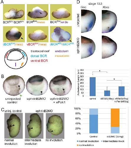 Fig. 9. Ephrin-B2 is required for peak involution. (A) Mesoderm induces Xbra in EphA4-expressing dorsal BCR. Tissues were combined at initial gastrula stage and fixed 2â