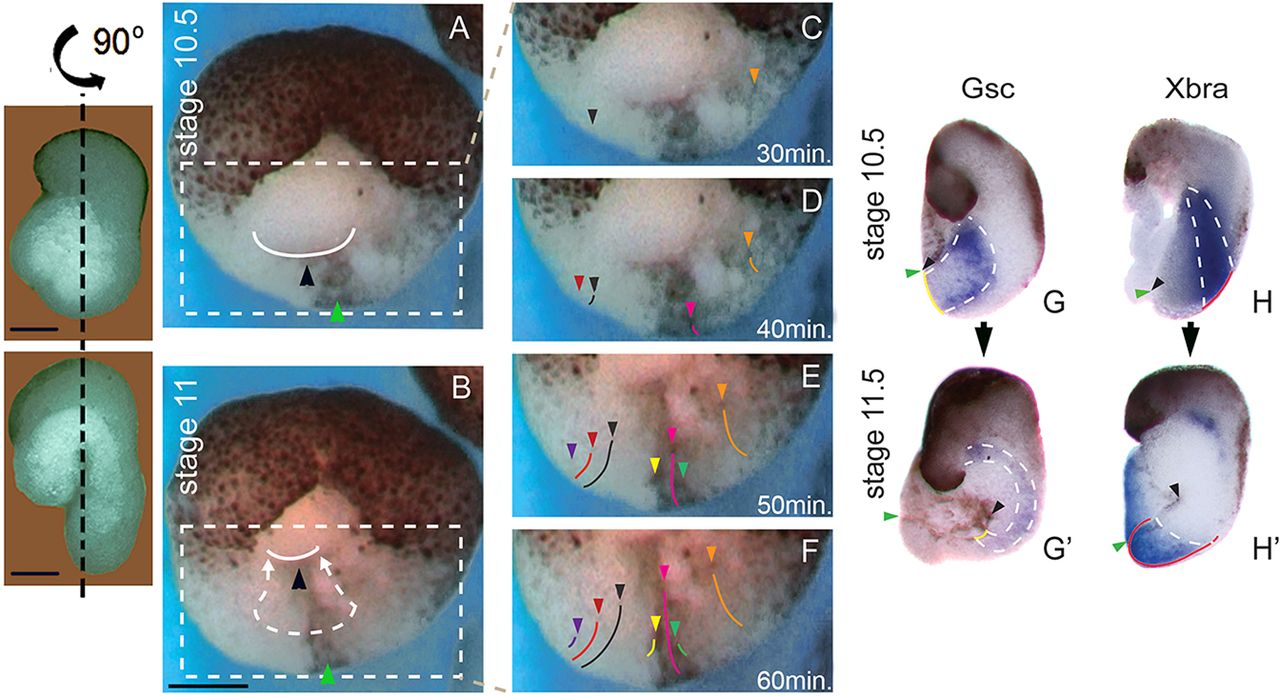 min (B) after explantation, viewed from inside the embryo (left, respective sagittal section views of fixed explants, for orientation). Animal to the top, green arrowhead, tip of lip; black arrowhead, bottle cell position. (C-F) Higher magnification of squares in A,B. Arrowheads and lines indicate pathways of landmarks. Sequential appearance of landmarks indicates involution, pathways converge towards midline. (G-Hâ²) Mesoderm regions identified by Gsc and Xbra expression in explants. Arrowheads, red and yellow lines as in Fig. 1E,F. Animal to the top, dorsal to the right. Scale bars: 100â
