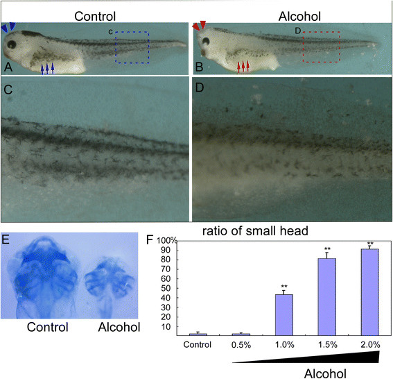 Figure 1. Alcohol exposure impaired pigment and cranial cartilage formation. (A,C) Control embryos show normal amount and pattern of pigment cells. (B,D) Alcohol treated embryos develop less and punctate pigment cells. (E) Alcohol treated embryos at stage 45 exhibited truncated cranial cartilage. Compared to control embryos, both Meckelâs and palatoquadrate were absent from treated embryos and the ceratohyal cartilages were markedly smaller. (F) The alcohol exposure deteriorates cartilage formation. Ratio of small to total heads exhibit no significant difference between control (2.3%â±â1.5%, nâ=â190) and 0.5% alcohol condition (2.3%â±â0.7%, nâ=â214). Additionally, 1% alcohol treatment considerably increased the phenotype of small head (43.4%â±â4.4%, total embryo nâ=â234), and 1.5% and 2.0% dramatically augment the deformation to 81.2%â±â6.5% (nâ=â205) and 91.6%â±â3.0% (nâ=â235) respectively (Pâ<â0.01). At each concentration, the experiments were repeated 3 times, and n represents the total embryos of triplicate assay. The values represent means ± SEM. pâ<â0.01, by student T test.