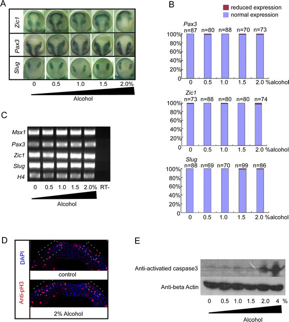 Figure 2. xposure to lower concentration of alcohol had no significant toxicity to neural crest development. We harvested the embryos at stage 16 for Whole-mount In Situ Hybridization (WISH). (A) Both boarder determinator gene Pax3, Zic1 and neural crest specification marker gene slug are kept intact. (B) Quantification of the effect of alcohol exposure on the expression of neural crest markers. (C) RT-PCR assays display expression of Msx1, Pax3, Zic1 and Slug are identical according to divergent alcohol treatment. (D,E) Alcohol less than 2% did not trigger abnormality of cell proliferation (labeled with pH3). Neural crest cell apoptosis was induced by 2% alcohol treatment as shown by activated caspase3. (normalized with beta actin).