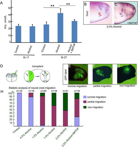 RESULTS: Pre-gastrulation exposure of 2-4% alcohol induces apoptosis in Xenopus embryo whereas 1% alcohol specifically impairs neural crest migration without observing discernible apoptosis. Additionally, 1% alcohol treatment considerably increased the phenotype of small head (43.4% ± 4.4%, total embryo n = 234), and 1.5% and 2.0% dramatically augment the deformation to 81.2% ± 6.5% (n = 205) and 91.6% ± 3.0% (n = 235), respectively (P < 0.05). Significant accumulation of Homocysteine was caused by alcohol treatment in embryos and 5-mehtyltetrahydrofolate restores neural crest migration and alleviates homocysteine accumulation, resulting in inhibition of the alcohol-induced neurocristopathies.