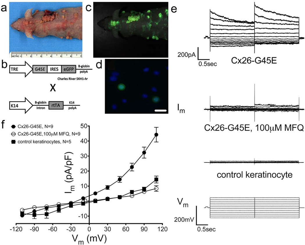 Figure 5. Mefloquine inhibited hemichannel activity in transgenic Cx26-G45E primary keratinocytes(a–b) Cx26-G45E mice recapitulate the epidermal pathology of KID syndrome using inducible tissue-specific expression of Cx26-G45E and eGFP in a hairless background, (c) In vivo fluorescence imaging demonstrated spatial correlation of fluorescence with skin lesions, (d) Keratinocytes isolated from Cx26-G45E lesions retained eGFP expression, facilitating their identification for patch-clamp electrophysiology (bar, 10µm). (e) Whole-cell membrane currents (Im) were recorded by patch-clamp electrophysiology. Nominal currents were observed in control keratinocytes. (f) Current density plotted against membrane potential (Vm) showed large macroscopic currents were elicited from Cx26-G45E cells (N=9) that were diminished by the addition of 100µM mefloquine (N=9) to levels resembling control cells (N=5). Data are means ± SEM.