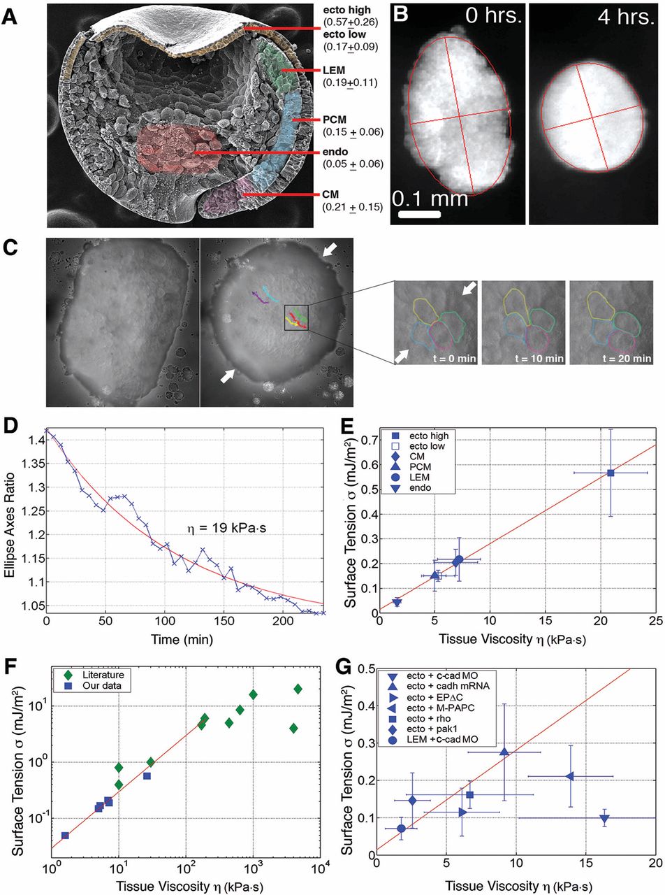 Fig. 1. Tissue surface tension and viscosity. (A) Scanning electron microscopy image of gastrula, indicating the regions explanted for measurements. LEM, leading edge mesendoderm; PCM, prechordal mesoderm; CM, chordamesoderm; endo, endoderm; ecto, ectoderm. Surface tension values are given (mJ/m2) with s.d. (B-E) Tissue viscosity measurement. (B) Ectodermal explant at beginning of rounding (left) and 4â h later. Major and minor axes of fitted ellipses are indicated (red lines). (C) Cell rearrangement during explant rounding. Intercalating cells are outlined in the high-magnification frames to the right. Arrows indicate the long axis of the explant. (D) Timecourse of the axis ratio (blue) of LEM explant fits to a dying exponential (red). (E) Proportionality of surface tension and viscosity (tissues as in A). Bars indicate 95% confidence intervals. Slope of the regression line (red), 1.60â µm/min; correlation coefficient, 0.9988. (F) Log-log plot of surface tensions and viscosities of tissues from E and from the literature (supplementary material Table S2). Slope of the regression line (red), 1.78â µm/min; correlation coefficient, 0.9923. (G) Experimentally treated tissues can be off the regression line (red) taken from E.