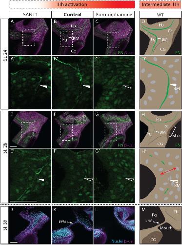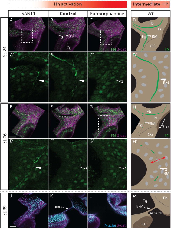 Fig. 2. Hedgehog signaling is necessary and sufficient for basement membrane dissolution. (AâC, EâGʹ) Sagittal sections through primary mouth stained for β-catenin in magenta, fibronectin (FN) and nuclei in green. (Fg) foregut, (BM) basement membrane, (Fb) forebrain, (Cg) cement gland. (AâC) Stage 24. (A) Embryo treated with 10 μM SANT1 from the 2-cell stage. (Aʹ) Magnified view of endodermâectoderm interface and basement membrane. FN is observed (white arrowhead) (n=7). (B) Control. (Bʹ) FN immunofluorescence indicates the presence of BM between foregut and ectoderm (white arrowhead, n=7). (C) Embryo treated with 250 μM purmorphamine. (Cʹ) No FN immuofluorescence is observed between foregut and ectoderm (open white arrowhead, n=6/7). (DâDʹ) Schematic indicating anatomy of sections represented in BâBʹ. Fibronectin-rich basement membrane separates foregut and ectoderm. (EâGʹ) Stage 26. (E) Embryo treated with 10 μM SANT1. (Eʹ) shows persistent FN immunofluorescence (white arrowhead, n=8). (F) Stage 26 control. (Fʹ) Almost no BM FN is observed in controls (open arrowhead, n=12). (G) Stage 26 embryo treated with 100 μM purmorphamine. (Gʹ) No FN immuofluorescence is observed (open white arrowhead, n=10). (HâHʹ) Schematic indicating anatomy of WT sections represented in FâFʹ. Fibronectin-rich basement membrane is absent or broken, foregut and ectoderm cells mix (red arrow). (JâL) Sagittal sections of stage 39 tadpoles stained for β-catenin (magenta) and DAPI. (J) Tadpole treated with 10 μM SANT1 (n=5). (K) Control tadpole. BPM is observed as a single layer epithelium (n=6). (L) Tadpole treated with 100 μM purmorphamine. No BPM is present (n=4). Scale bars indicate 50 μm. (M) Schematic indicating anatomy of WT sections represented in (K). Buccopharyngeal membrane (BPM) separates foregut from external environment and indicates site of future mouth. |