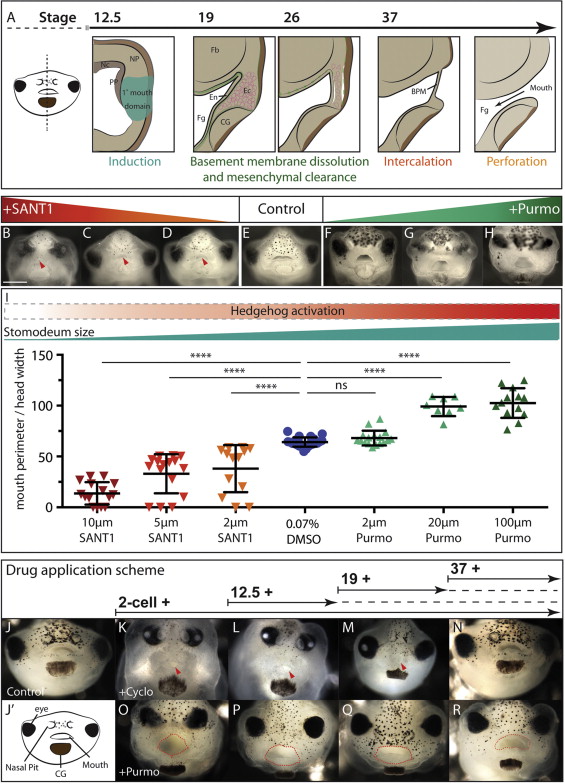 Fig. 1. Hedgehog perturbation affects the size of the oral opening. (A) Schematic illustrating primary mouth development. Frontal view of Xenopus tadpole indicates sectional plane for schematics. Stage 12.5, primary mouth induction occurs anterior to the prechordal plate (PP), notochord (Nc) and neural plate (NP). Stage 19 foregut endoderm (Fg) abuts mouth ectoderm (Ec, pink), separated by fibronectin-rich basement membrane (BM, green), between forebrain (Fb) and cement gland (CG). BM dissolves and mesenchymal clearance thins stomodeum (green dashed line indicates BM). Stage 37, buccopharyngeal membrane (BPM) formation. Stage 40, BPM perforation. (BâD) Frontal view of stage 45 tadpoles incubated from 2-cell stage with 10 μM (B), 5 μM (C), or 2 μM SANT1 (D) (B, n=13/13, C, n=16/16, D, n=15/15). Primary mouth is indicated by red arrowhead. (E) Control tadpole, 0.07% DMSO (n=26/26). (FâH) Tadpoles incubated with 2 μM (F), 20 μM (G) or 100 μM purmorphamine (H). Increase in mouth size was observed with increasing concentrations of purmorphamine (F, n=70/70, G, n=43/43, H, n=154/154). (I) Quantification of mouth size for 10 μM, 5 μM, or 2 μM SANT1, 0.07% DMSO, 2 μM, 20 μM or 100 μM purmorphamine, where mouth perimeter is normalized to width of the head. ââââP<0.001. Scheme indicating primary mouth size (green) in relationship to Hh activity (red bar). (J) Stage 45 control tadpole. (Jʹ) Facial anatomy schematic. (KâN) Tadpoles incubated with 250 μM cyclopamine from 2-cell stage (K), between stages 12.5â19 (L), 19â37 (M), or from 37 (N). (OâR) Tadpoles treated with 100 μM purmorphamine from the 2-cell stage (O), between stages 12.5â19 (P), 19â37 (Q), or from stage 37 (R). |