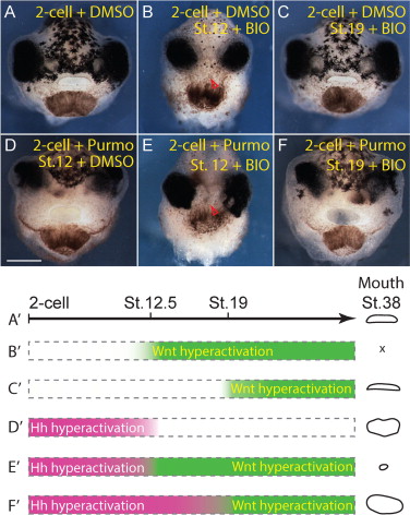 Fig. 3. Wnt inhibition acts downstream of Hh signaling during BPM dissolution. (AâF) Stage 38 tadpoles. (A) Control tadpole incubated with 0.7% DMSO continuously from 2-cell stage. (B) Tadpole incubated with 0.7% DMSO, then 15 μM BIO from stage 12.5 (n=34). (C) Tadpole incubated with 0.7% DMSO, then 15 μM BIO from stage 19 (n=34). (D) Tadpole incubated with 100 μM purmorphamine, then 0.07% DMSO from stage 12.5 (n=34). Primary mouth is enlarged. (E) Tadpole incubated with 100 μM purmorphamine, then 15 μM BIO from stage 12.5 (n=34). (F) Tadpole incubated with 100 μM purmorphamine, then 15 μM BIO from stage 19 (n=34). Scale bars indicate 100 μm. (G) Schematic indicating drug application scheme and outcome. Red arrowheads (B and E) indicate absence of primary mouth. |