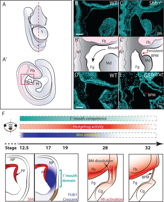 Fig. 4. Sonic hedgehog and Gli3 are required for perforation of the mammalian BPM. (A) Schematic frontal view of E9.0 mouse embryo. Dashed line indicates section plane. (B) Schematic of section. Red box indicates region represented in panels (C) and (Dʹ). (Fb) forebrain, (Fg) pharyngeal foregut, (H) Heart. (CâD) Nuclei are stained with DAPI (cyan) (B) Sagittal section of E9.0 (20 somite) Shh+/+ embryo (n=3). (Bʹ) Schematic illustrating anatomy in (B). (C) Sagittal section through E9.0 Shhâ/â embryo (n=3). (Cʹ) Schematic illustrating anatomy depicted in (C). (DâE) Sagittal sections through E9.0 (19 somite) Gli3+/+ and Gli3xt/xt embryos, respectively. Remnant buccopharyngeal membrane (BPM) is observed in Shhâ/âand Gli3xt/xt embryos. Nuclei are stained with DAPI (cyan). Scale bars indicate 100 μm. BâC are littermates, as are DâE. (F) Proposed model of primary mouth formation in Xenopus. Frontal schematic indicates sectional plane of diagrams. Cyan bar indicates stages of primary mouth competence. Red bar indicates level of Hh activation while blue indicates Wnt inhibition, where white is none, and bright color is high. Wnt inhibitors Crescent and Frzb-1 are expressed in primary mouth ectoderm (blue). Primary mouth ectoderm is induced adjacent to Hh signal where Wnt inhibition is highest (cyan bracket). By stage 28, BM is indicated by white outlines, and mesenchymal cells are illustrated in black. Hh signal activation (red) is highest ventral to the forebrain (Fb). (Cg) and (Fg) indicate cement gland and foregut, respectively. Wnt inhibitors are no longer expressed, and stomodeum is refractive to Wnt activation. By stage 39, endodermâectoderm intercalation forms monolayer buccopharyngeal membrane (BPM). Hh signal activation is required through intercalation stages. |