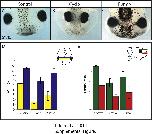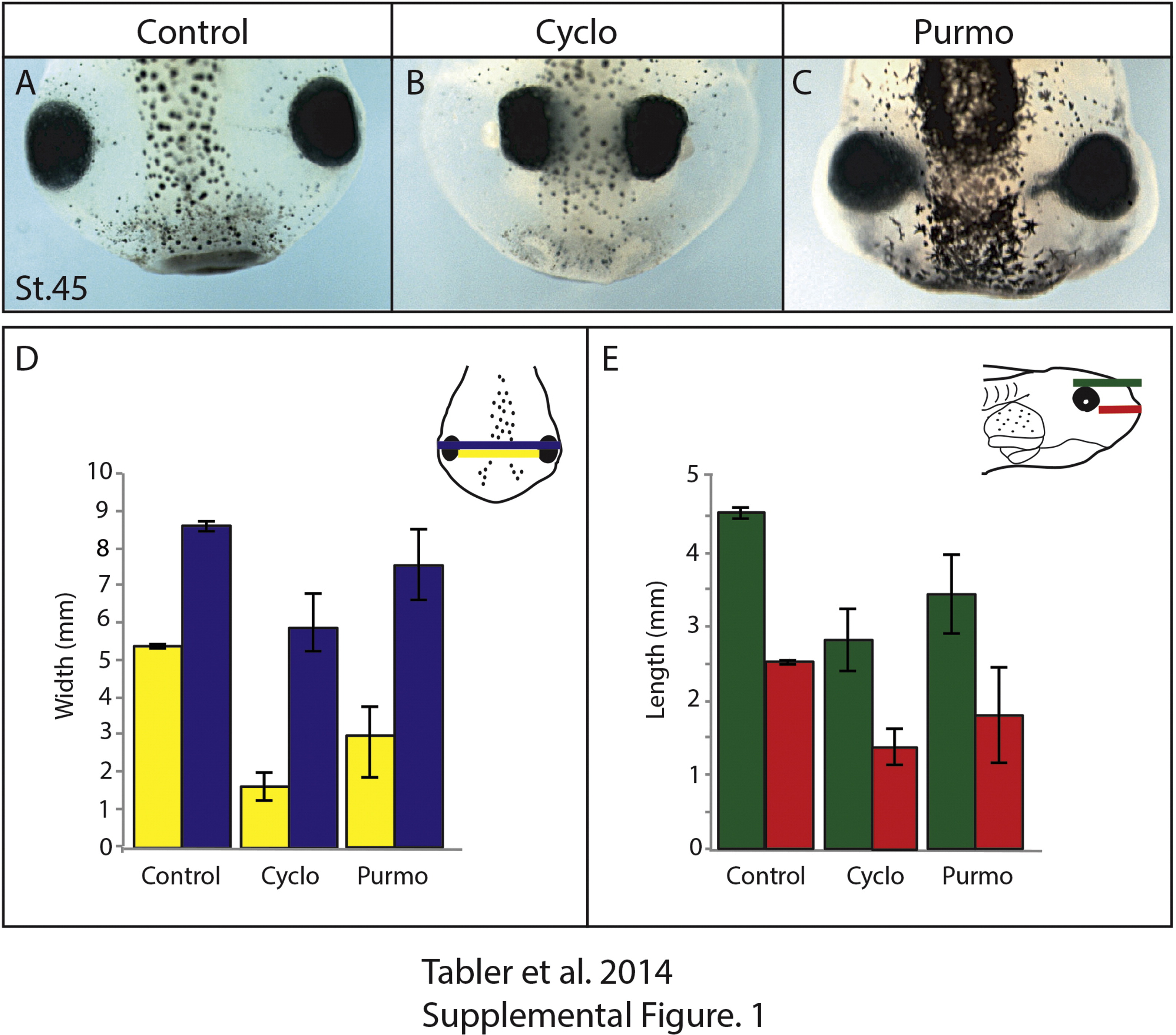 Supplementary Fig. 1. related to Figure 1: Activation and inhibition of Hh signaling narrow the head. (AâC) Dorsal views of stage 45 tadpoles. (A) Control treated tadpole. (B) 250 μM cyclopamine treated from the 2-cell stage. Eyes (black) are close-set and head is narrow compared to controls. (C) Tadpole treated with 100 μM purmorphamine from the 2-cell stage. Eyes (black) are close-set and head is narrower than controls. (D) Graph showing total width of head at the level of the eye (blue) and the distance between eyes (yellow) in stage 45 tadpoles. According to both measurements cyclopamine and purmorphamine treatment significantly decreased the width of tadpole heads compared to control treated tadpoles (p<0.001, cyclopamine treated compared to control, and p<0.001, purmorphamine compared to control). Diagram indicates measurement planes. (E) Graph indicating head length from the anterior-most extent of the head to either the posterior (green) or anterior extent of the eye (red). According to both measurements cyclopamine and purmorphamine treatment significantly decreased head length compared to controls (p<0.001, cyclopamine treated compared to control, and p<0.001, purmorphamine compared to control). Diagram indicates measurement planes. |
