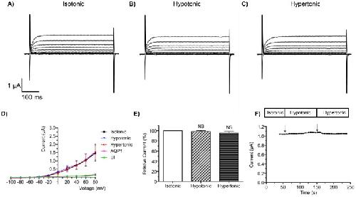 Figure 2. Sensitivity of Slack channels to changes in cell volume.Slack channels were co-expressed with AQP1 in Xenopus laevis oocytes and activated with a voltage protocol, as described in figure 1, under isotonic (A), hypotonic (B) and hypertonic media (C). (D) shows the corresponding I/V curves under isotonic (black), hypotonic (blue) and hypertonic (red) conditions. Control experiments for native, un-injected oocytes (UI, green) and oocytes only expressing AQP1 (violet) are also shown. In (E), maximal currents were measured at the end of the +80 mV depolarizing step under isotonic, hypotonic and hypertonic buffers and the currents were normalized to the current measured at isotonic conditions. Data points in panels (D) and (E) show the mean of 10 independent experiments ± S.E.M. (F) shows a current trace over time for a representative oocyte expressing Slack and AQP1. The channels were activated by a protocol as described in figure 1.