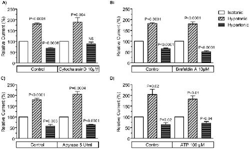 Figure 4. Mechanisms for cell volume regulation of Slick K+ channels.Slick channels were co-expressed with AQP1 in Xenopus laevis oocytes and the channels were activated by depolarizations to +80 mV for 500 ms (holding potential: −80 mV). In all cases, the maximal currents (at the end of the depolarization period) were measured in isotonic, hypotonic and hypertonic media and are shown as relative changes in the current during cell swelling (hatched bars) and shrinkage (horizontal bars) as compared to the current under isotonic conditions (open bar). The figures show the effect of (A) cytochalasin D (10 µM, preincubation 24 hours), (B) Brefeldin A (10 µM, preincubation 8 hours), (C) Apyrase (5 U/ml) and (D) ATP (100 µM). All values are given as means ±SEM (n = 6–8).