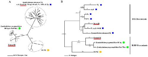 Figure 3. Phylogenies of Symbiodinium clade B long sPCP cassette sequences.(A) Maximum likelihood tree of all non-chimeric clones. (B) Most parsimonious tree of most frequently recovered non-chimeric clones. Branch lengths for the most parsimonious tree are shown above the branches. Support values >70% based on +1000 bootstrap trees are shown in parentheses. Support values for minor branches of the maximum likelihood tree are not displayed. Blue squares = B/B1/B184; Green circles = B/B2/B224 (descendant of B/B19); Orange circles = B/B19/B211. The positions of Dstok28 and Dstrig102 are underlined in red. The topologies of both trees are congruent with each other.