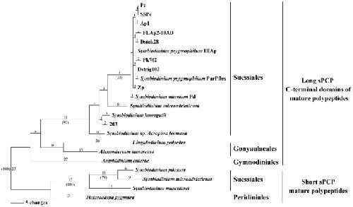 Figure 5. Phylogeny of short and long sPCP predicted amino acid sequences from four dinoflagellate orders.The most parsimonious tree shows unambiguous resolution of short and long sPCP sister clades. Branch lengths are shown above the branches. Support values >70% based on +1000 bootstrap trees are shown in parentheses below branches. The long sPCP genes were produced from fusion of duplicated short sPCP genes that occurred once early during the evolution of peridinin-containing dinoflagellates. Thereafter, short and long sPCP genes and corresponding polypeptides diverged.