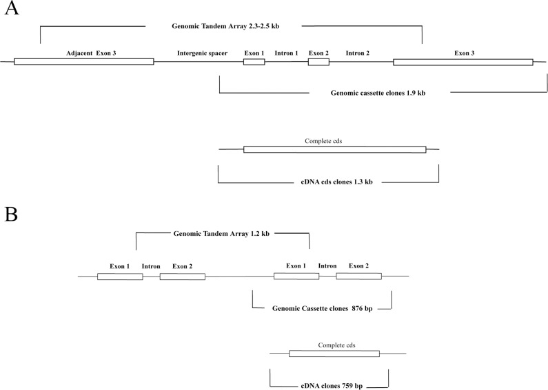 Figure 2. Maps showing the organization of Symbiodinium sPCP tandem genes containing introns and the corresponding cDNAs.(A) Long sPCP genes from clade B/B1 and B19 descendant isolates contained two introns. The CDS identified in genomic and cDNA clones was ∼1.1 kb. (B) Short sPCP genes from S. microadriaticum (clade A/A1) had one intron and the CDS was ∼600 bp.