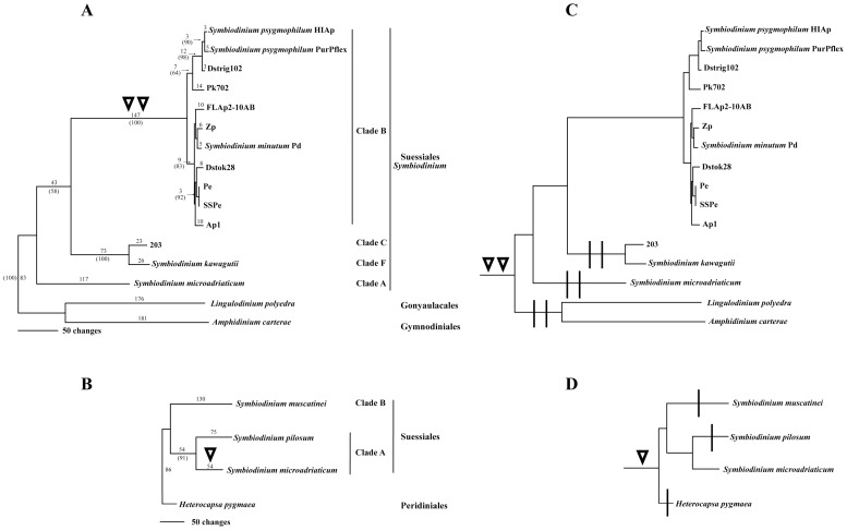 Figure 4. Phylogenies of long and short sPCP coding sequences (excluding introns) from four dinoflagellate orders.(A) Most parsimonious tree for long sPCP CDS data from the Suessiales, Gonyaulacales and Gynnodiniales. (B) Most parsimonious tree for short sPCP CDS from the Suessiales and Peridiniales. Branch lengths are shown above the branches. Support values >50% based on +1000 bootstrap trees are shown in parentheses below branches. Double inverted triangles = the long sPCP branch leading to Symbiodinium clade B sequences, each of which contained two introns. Single inverted triangle = the short sPCP branch for the S. microadriaticum sequence that had a single intron. (C) Long sPCP tree redrawn to indicate possibility of ancient introns present in the most recent common ancestor of Suessiales, Gonyaulacales and Gynnodiniales. Vertical bar = loss of an intron on an ascending branch required to explain the data. (D) Short sPCP tree redrawn to indicate possibility of an ancient intron present in the most recent common ancestor of Suessiales and Peridinales. Required losses on ascending branches are indicated as before.