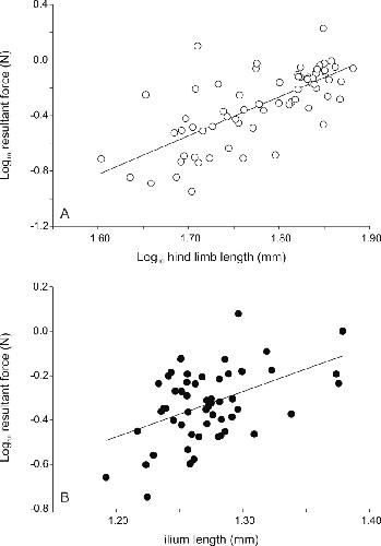 Figure 2. Scatter plots illustrating the relationships between morphology and the peak resultant force for female (A) and male (B) frogs.While hind limb length is the best predictor of jump force in females, the length of the ilium is the best predictor in males (r = 0.467; P < 0.001; see Table 1). Thus females with longer legs and males with longer ilia are better jumpers (r = 0.717; P < 0.001; see Table 1). Each symbol represents the single best jump for an individual. Open symbols represent females, filled symbols represent males.