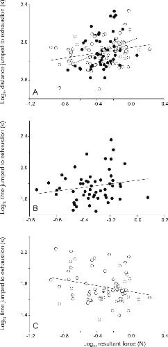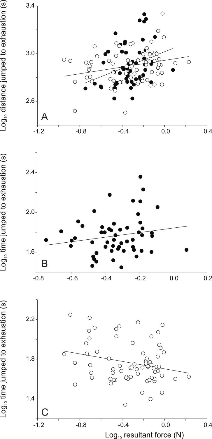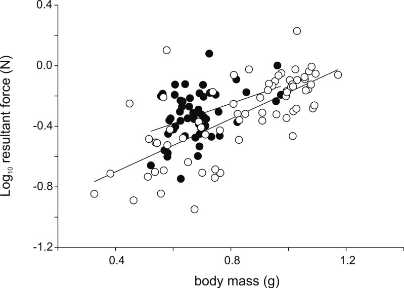Figure 3. Scatter plot illustrating the differences in the resultant jump force for a given body mass.Note that males (intercept = −0.78; slope = 0.66; R2 = 0.15; P = 0.003) are better jumpers than females (intercept = −1.05; slope = 0.88; R2 = 0.50; P < 0.001) for their size (Table 1). Each symbol represents the single best jump for an individual. Open symbols represent females, filled symbols represent males.