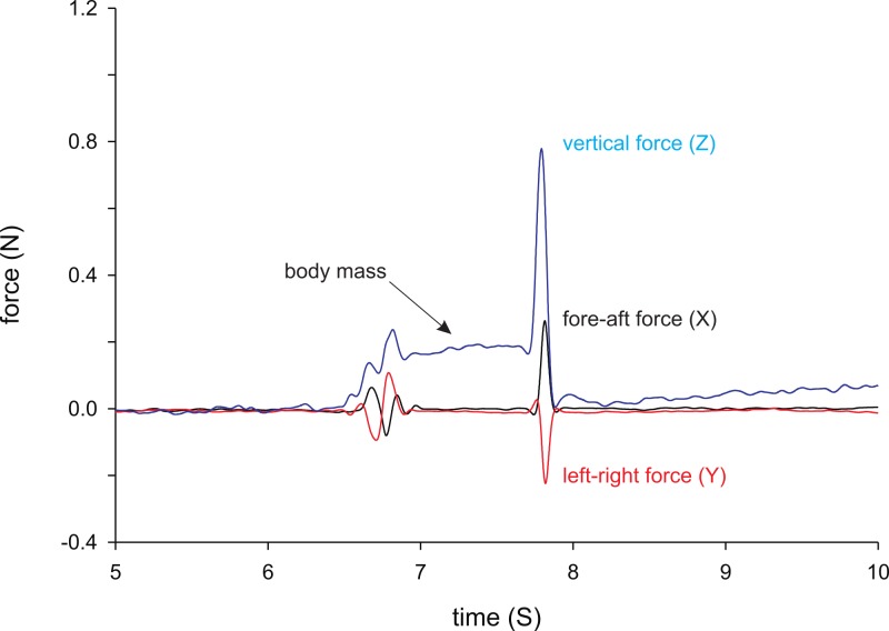 Figure 1. Example force trace from a female X. tropicalis jumping.Indicated are the Z (vertical), X (short axis of the force plate) and Y (long axis of the force plate) forces. Note that the animal is not always positioned in line with the long axis of the force plate, and that horizontal forces cannot be interpreted in terms of fore-aft or medio-lateral forces. When the animal is placed on the force plate the Z-force increases as a result of the weight of the animal as indicated in the figure. Jumping is characterized by a rapid increase in the vertical, as well as in the horizontal forces.