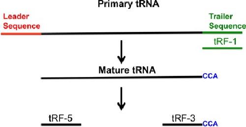 Figure 1. Illustration of primary tRNA, mature tRNA and tRF-5, -3 and -1. tRF-1 (shown in green) is generated from primary tRNA. tRF-5 and -3 are produced from mature tRNA. The tRF-3s always have âCCAâ at their 3â² end.