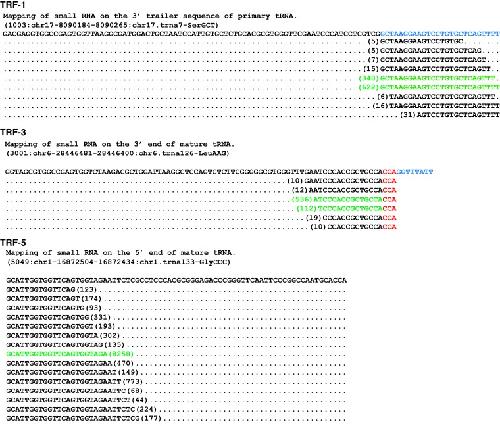 Figure 2. The patterns of small RNA deep sequencing reads (GSM416733) mapping to tRNA genes. Examples of small RNA reads that mapped to specific tRNAs are shown. More than 80% of reads for a given tRF-1, -3 or -5 represent one or two most abundant reads and this is the read that is included as the main tRF sequence in the database. The most abundant clones are shown in green. Upper: tRF-1-like sequences mapping to the primary tRNA chr17.trna7-SerGCT. Middle: tRF-3-like sequences mapping to the mature tRNA chr6.trna126-LeuAAG. Lower: tRF-5-like sequences mapping to the mature tRNA chr6.trna126-LeuAAG.