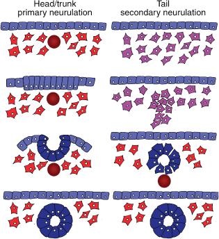 Figure 1. Primary vs. secondary neurogenesis. The neural tube of the primary body axis is formed from the rolling up of the lateral edges of ectodermal neural plate toward the midline [marked by the dorsal mesoderm, or notochord, (red circle) that runs directly underneath]. Cells of the neural plate first become columnar and polarized, before becoming wedge shaped, forcing the plate to bend. The neural folds eventually meet in the midline and cell adhesion changes cause budding off from the epidermal epithelium to form the neural tube. The tailbud derived neural tube is derived directly from condensing mesenchymal cells that undergo a mesenchymal to epithelial conversion. Although the source of the cells and the mechanism of tube formation are totally different, the trunk and tail neural tubes form a continuous structure. Diagram based on information in Catala et al.
